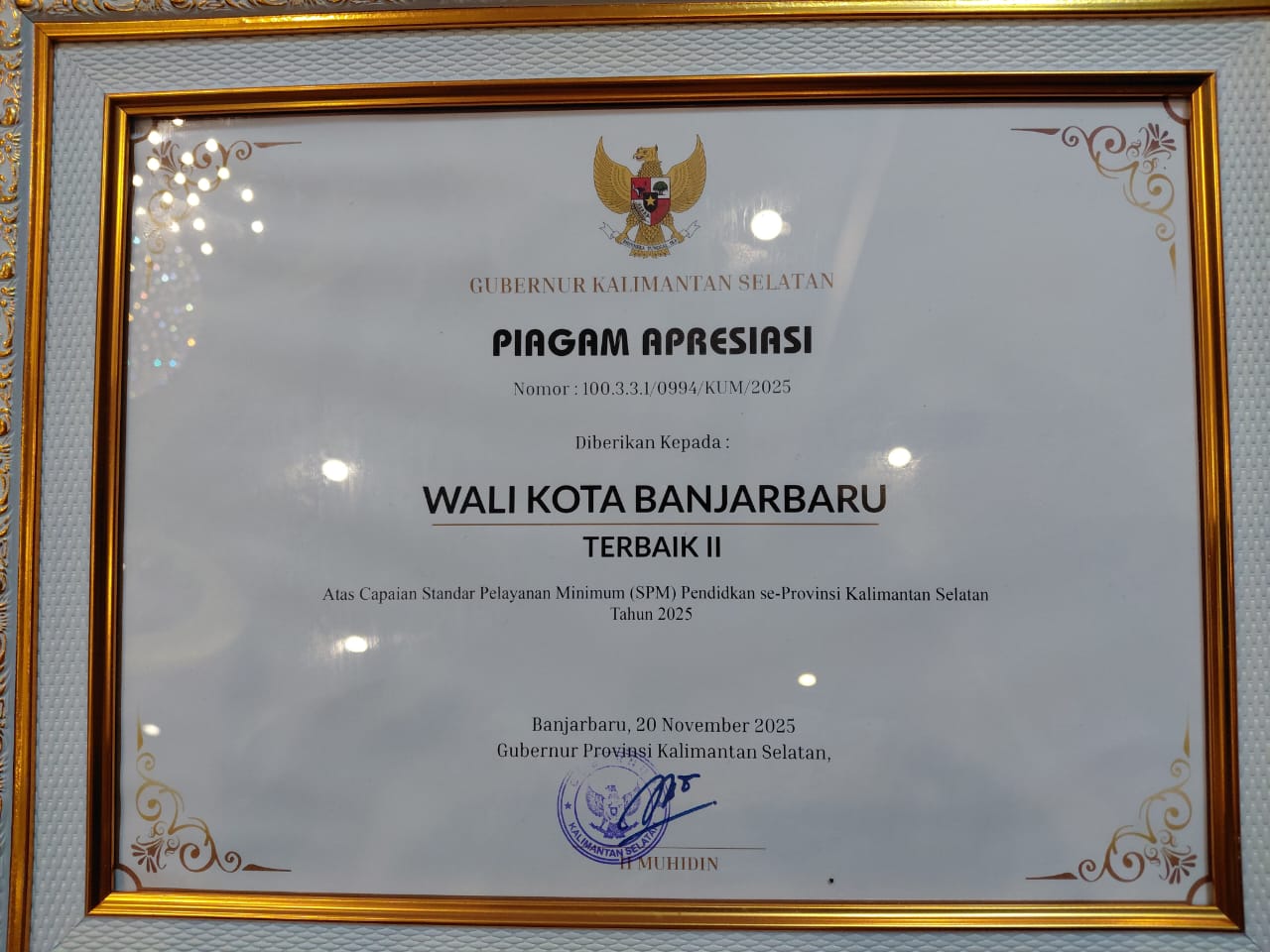 Piagam Apresiasi Terbaik II atas capaian Standar Pelayanan Minimum (SPM) Pendidikan se-Kalimantan Selatan 2025