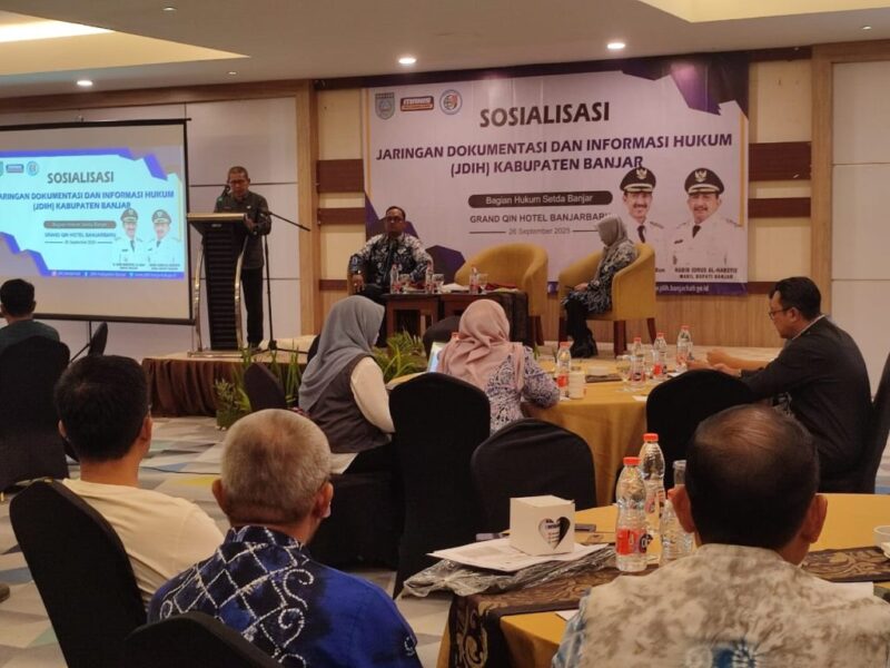 Martapura, matarakyat.co.id – Pemerintah Kabupaten Banjar mengadakan sosialisasi Jaringan Dokumentasi dan Informasi Hukum (JDIH) di Ruang Intan 1 Hotel Grand Qin, Banjarbaru, Jumat (26/9/2025).