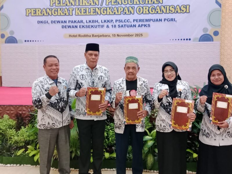 MARTAPURA, matarakyat.co.id — Struktur baru Dewan Kehormatan Guru Indonesia (DKGI) PGRI Kabupaten Banjar resmi dikukuhkan pada Minggu (15/11/2025) di Hotel Roditha Banjarbaru. Dalam kesempatan tersebut, Warhamni dilantik sebagai Wakil Ketua DKGI, mendampingi Ikhwansyah yang kini menjadi ketua sekaligus Pj Sekda Banjar. Posisi sekretaris dipercayakan kepada Kepala Dinas Pendidikan Kabupaten Banjar, Liana Penny.
